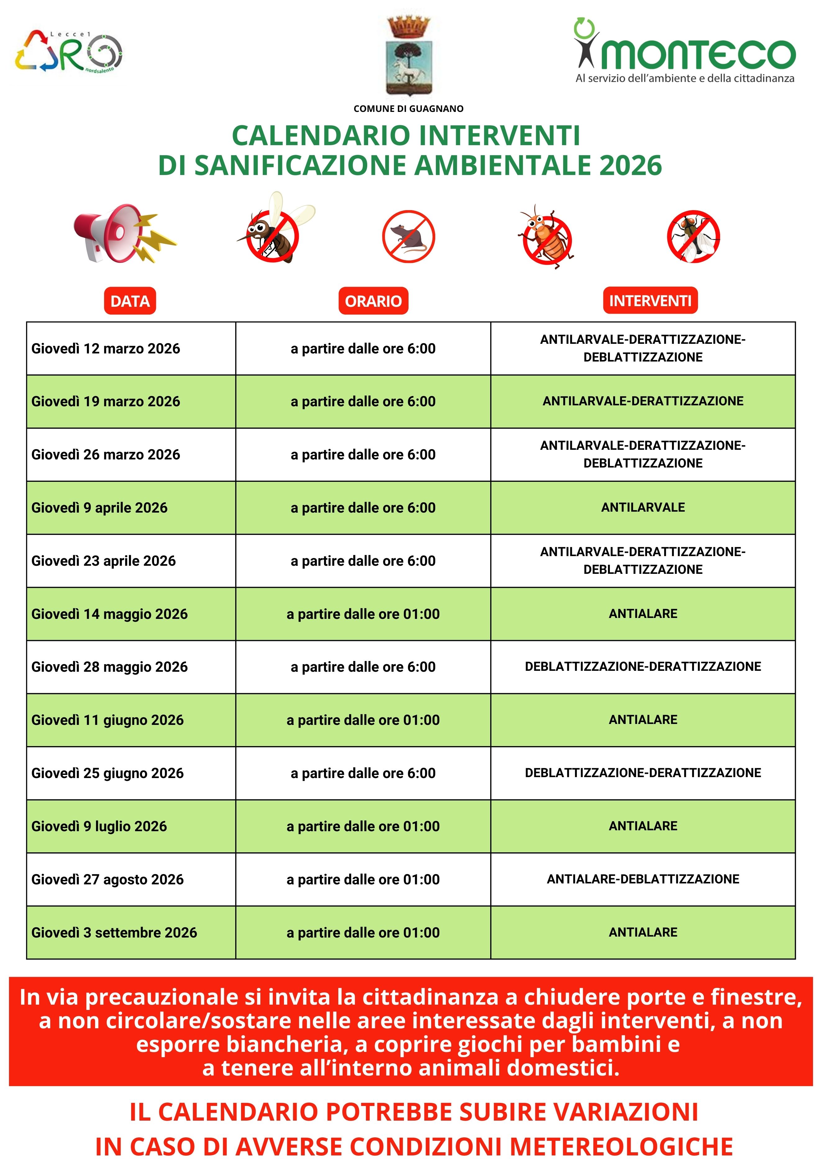 Per le date indicate nel calendario di INTERVENTI DI SANIFICAZIONE AMBIENTALE 2026, si invita tutta la cittadinanza del  Comune di Guagnano 𝗮 𝗰𝗵𝗶𝘂𝗱𝗲𝗿𝗲 𝗽𝗼𝗿𝘁𝗲 𝗲 𝗳𝗶𝗻𝗲𝘀𝘁𝗿𝗲, 𝗮 𝗻𝗼𝗻 𝗰𝗶𝗿𝗰𝗼𝗹𝗮𝗿𝗲/𝘀𝗼𝘀𝘁𝗮𝗿𝗲 𝗻𝗲𝗹𝗹𝗲 𝗮𝗿𝗲𝗲 𝗶𝗻𝘁𝗲𝗿𝗲𝘀𝘀𝗮𝘁𝗲 𝗱𝗮𝗴𝗹𝗶 𝗶𝗻𝘁𝗲𝗿𝘃𝗲𝗻𝘁𝗶, 𝗮 𝗻𝗼𝗻 𝗲𝘀𝗽𝗼𝗿𝗿𝗲 𝗯𝗶𝗮𝗻𝗰𝗵𝗲𝗿𝗶𝗮, 𝗮 𝗰𝗼𝗽𝗿𝗶𝗿𝗲 𝗴𝗶𝗼𝗰𝗵𝗶 𝗽𝗲𝗿 𝗯𝗮𝗺𝗯𝗶𝗻𝗶 𝗲 𝗮 𝘁𝗲𝗻𝗲𝗿𝗲 𝗮𝗹𝗹'𝗶𝗻𝘁𝗲𝗿𝗻𝗼 𝗮𝗻𝗶𝗺𝗮𝗹𝗶 𝗱𝗼𝗺𝗲𝘀𝘁𝗶𝗰𝗶.